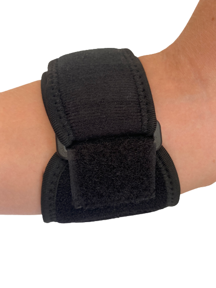 • De pelotte (kussentje) aan de binnenzijde van de elleboogbrace oefent druk uit op specifieke onderarmspieren. Op deze manier worden er geen trekkrachten meer uitgeoefend op bijbehorende (geïrriteerde) pezen, waardoor deze worden ontlast en kunnen gaan herstellen.